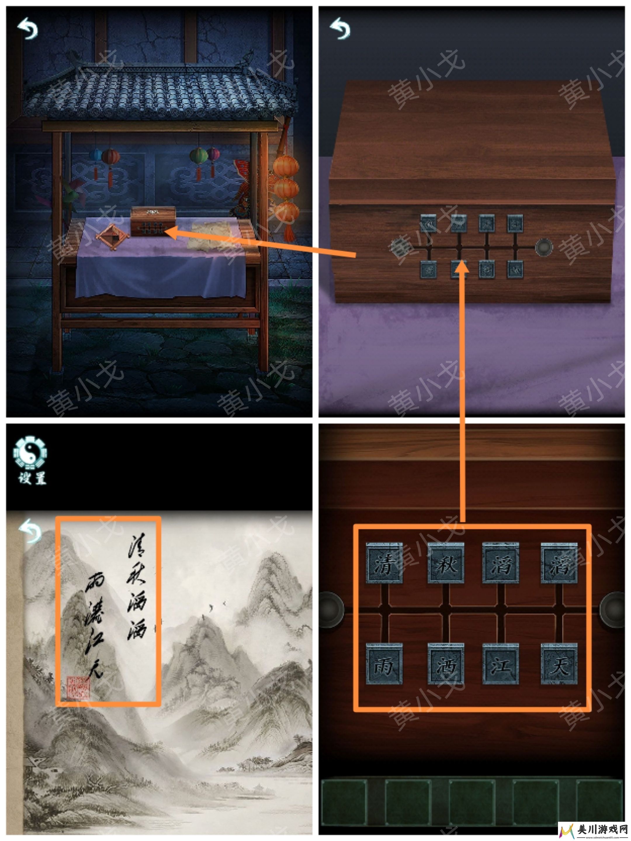 4.(酆都)点击右边摊位上的盒子,根据挂画上的线索,调整密码锁为(清秋滔滔,雨洒江天)
