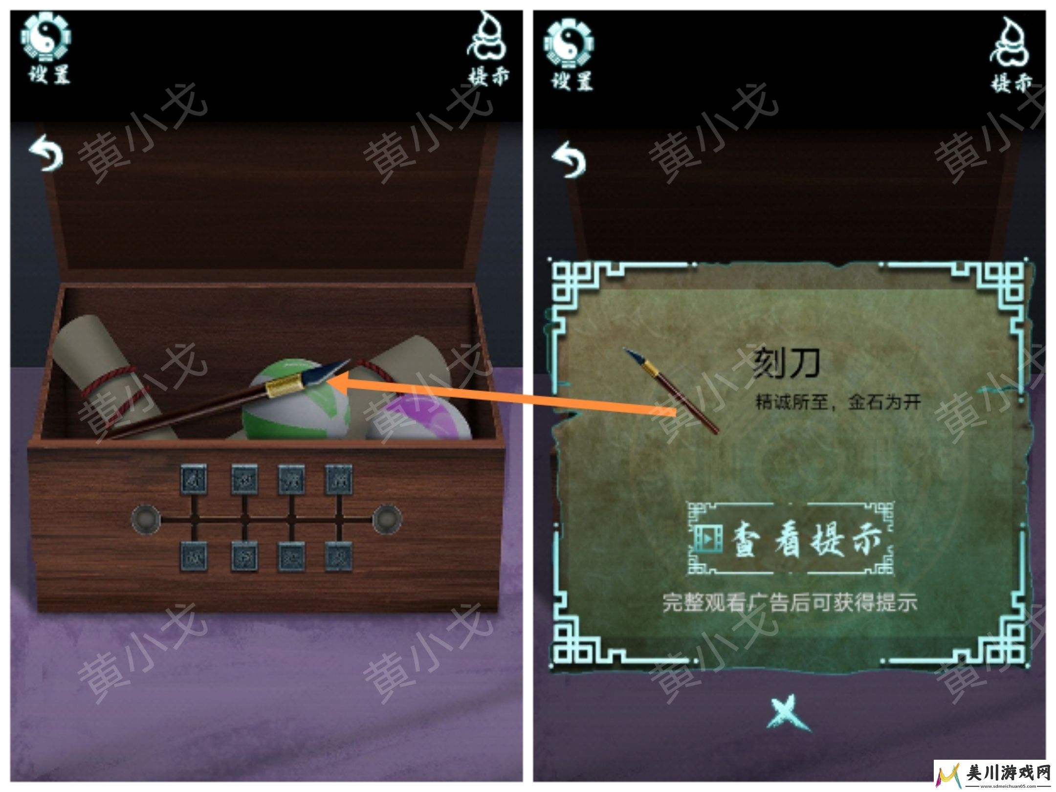 8.(城隍庙)点击桌子上的雕刻工具箱,放上【石块】,用【刻刀】雕刻;查看游戏说明,完成小游戏,获得【城隍印】