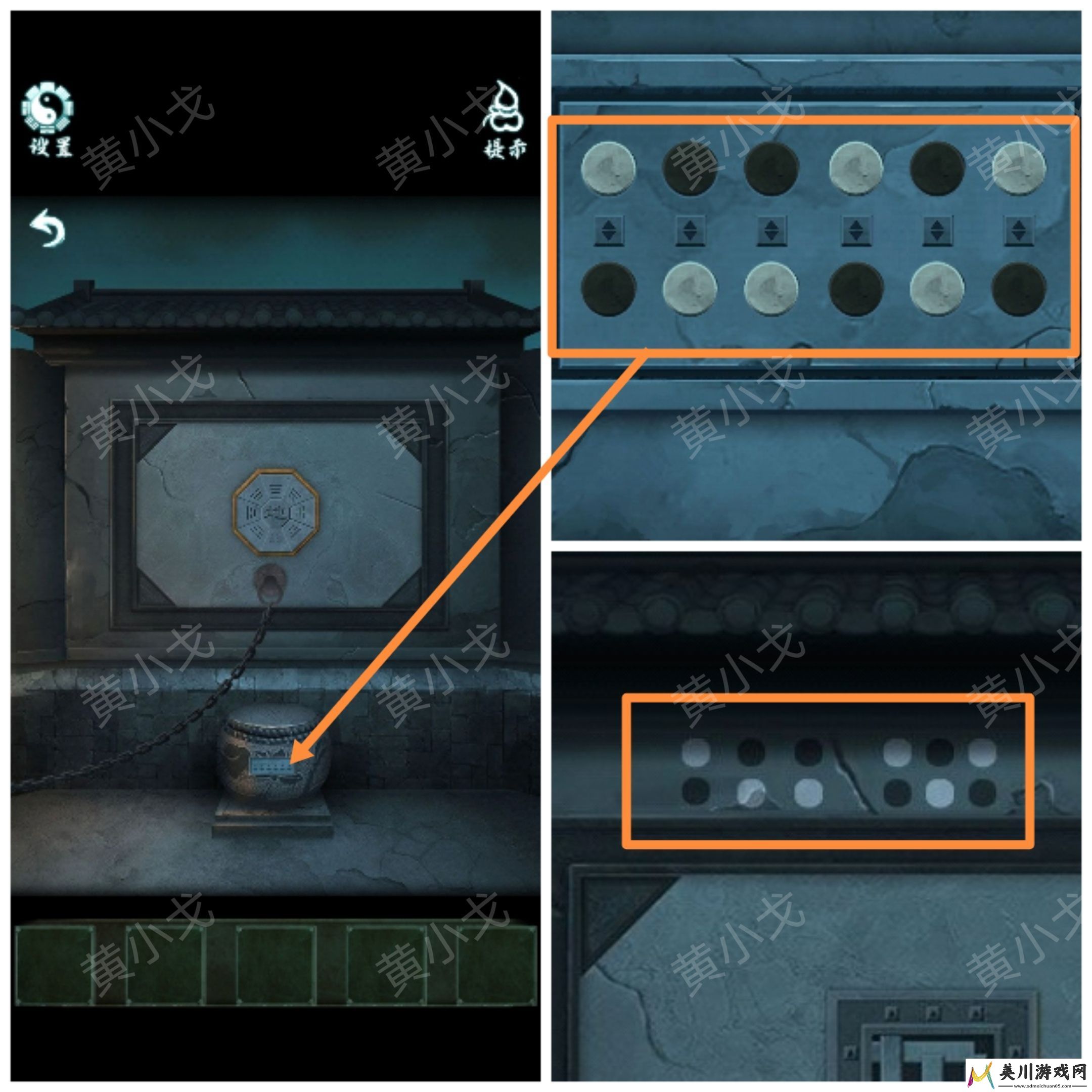 14.点击左边墙上的封印,查看游戏说明,完成小游戏(注意墙上的圆点:白黑黑 白黑白、黑白白 黑白黑)