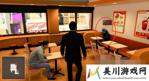 2、进入汉堡店,然后从左侧走楼梯上二楼,在角落可以找到带着蓝色帽子的委托人;